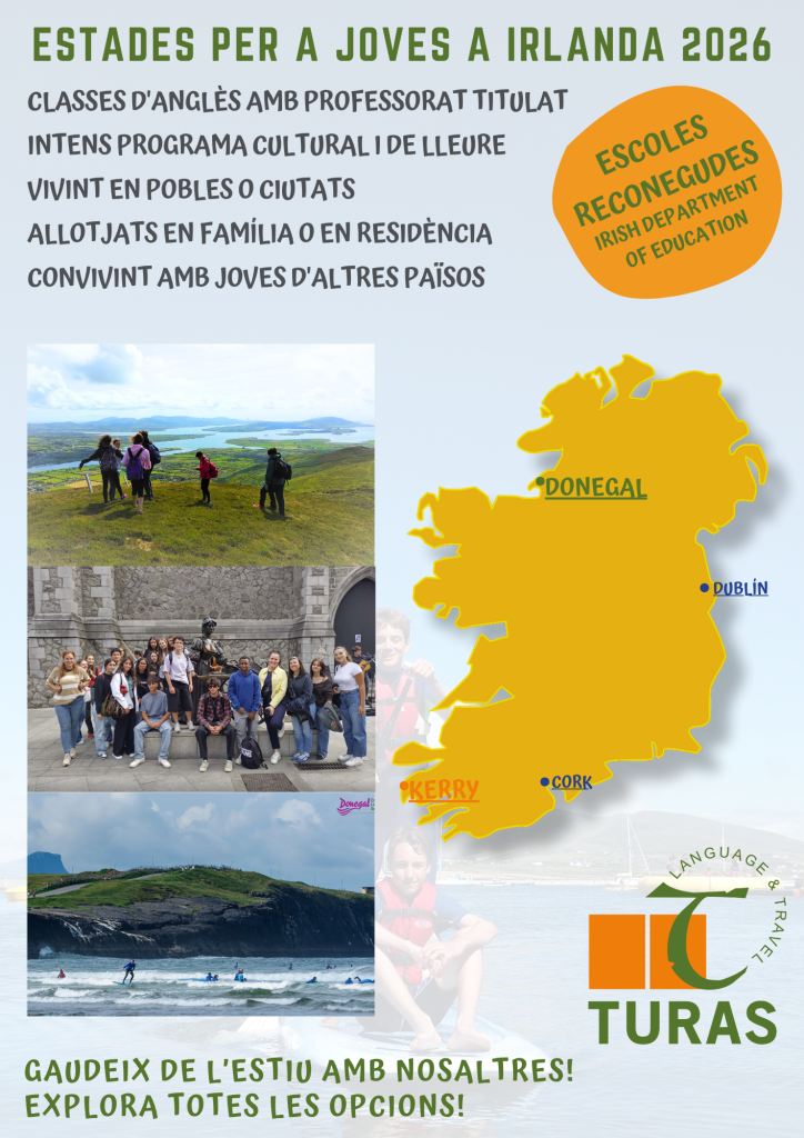 Estades internacionals per a joves que TURAS LANGUAGE & TRAVEL organitza durant els mesos de juliol i agost. Programes que combinen les classes d’anglès amb multitud de variades activitats i la convivència diària amb joves d’altres països. En destinacions petites o en una ciutat, allotjats amb famílies o en residència, i sempre en col·laboració amb acadèmies reconegudes per l’Irish Department of Education.